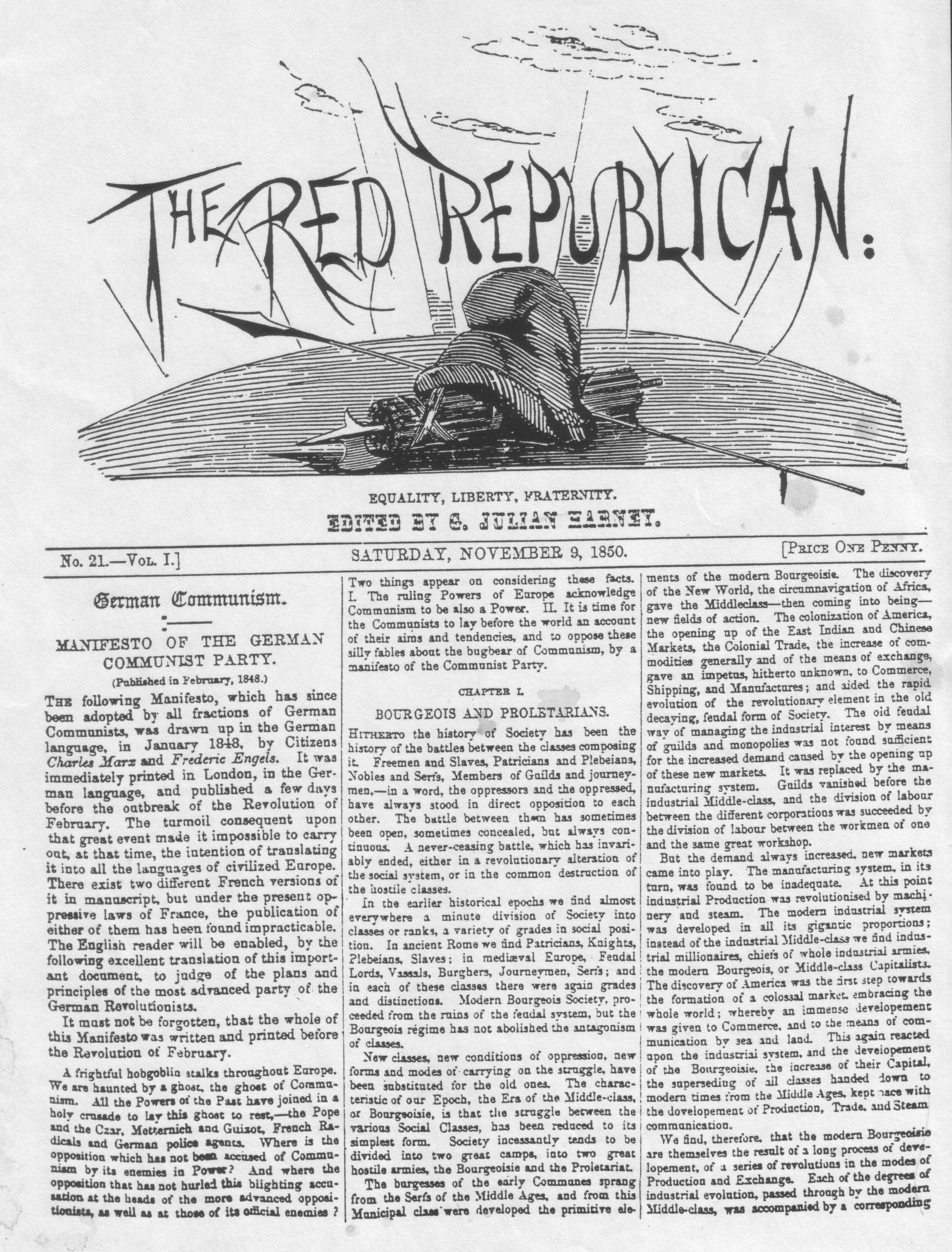 A Times leader of 2 September 1851, entitled ‘Literature For The Poor’, warns that Harney’s content, especially the serialised Communist Manifesto, might have an alarming appeal to those people in the lower orders who form a sort of secret society: